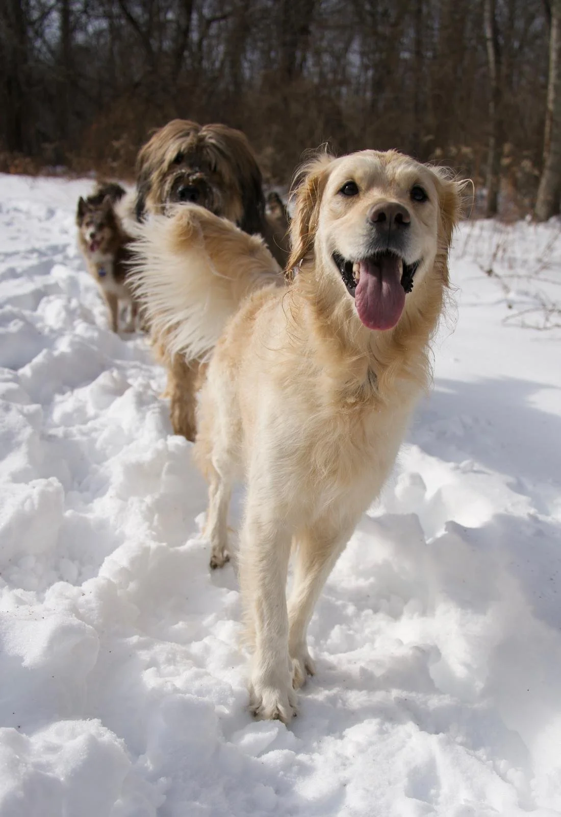 Is a 9-year-old yellow Lab who has been hiking with us for 6 years, and he’s very much the heart of the pack. Calm, confident, and endlessly friendly, he naturally takes younger or more nervous dogs under his wing and shows them the ropes on the trail. He helps set the pace, keeps the energy balanced, and somehow always seems to know when another dog needs a little encouragement or space. Watching Silas lead the way—tail wagging, nose to the breeze—you can see why the rest of the group instinctively trusts him.